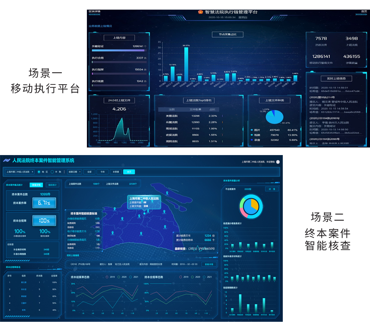 • 場(chǎng)景二、終本案件智能核查:終本案件的辦案信息、辦案過(guò)程的電子卷宗自動(dòng)上鏈固化, 向申請人公示個(gè)案終本達成過(guò)程和證明材料。